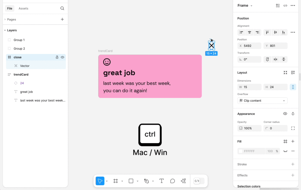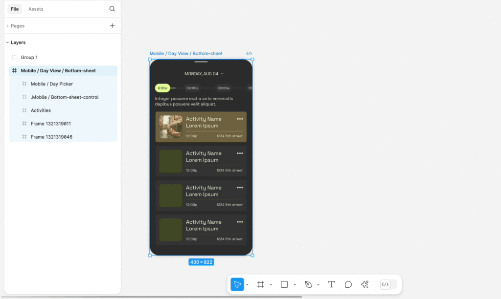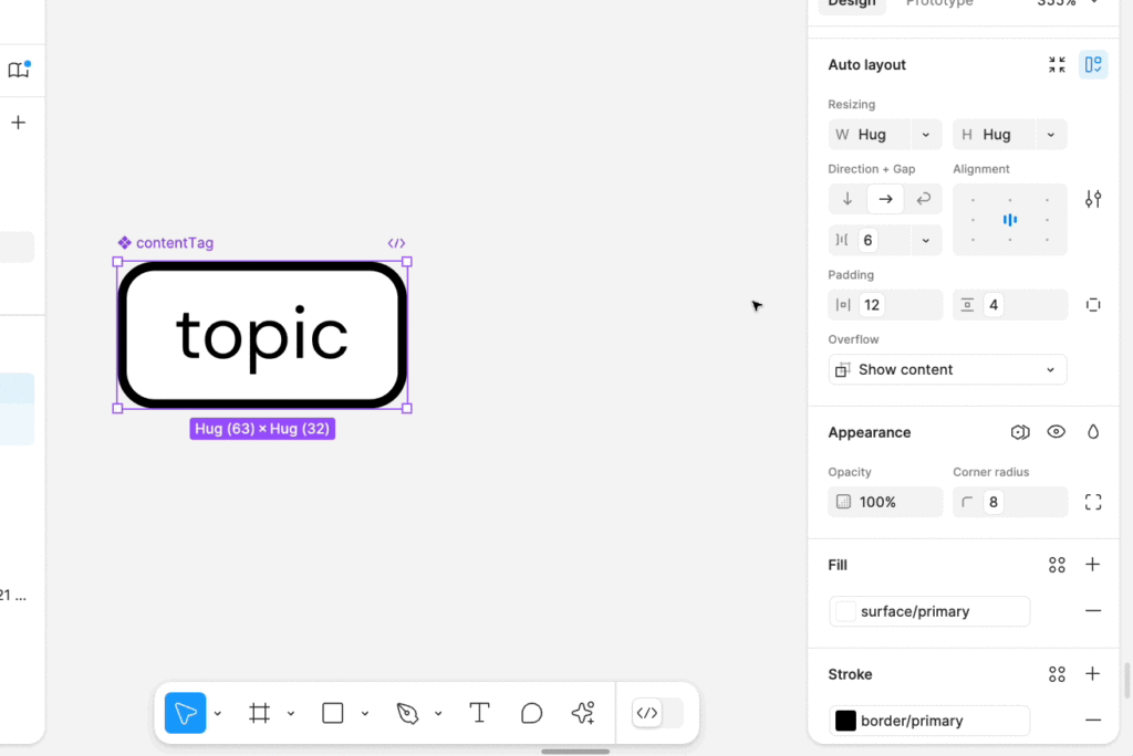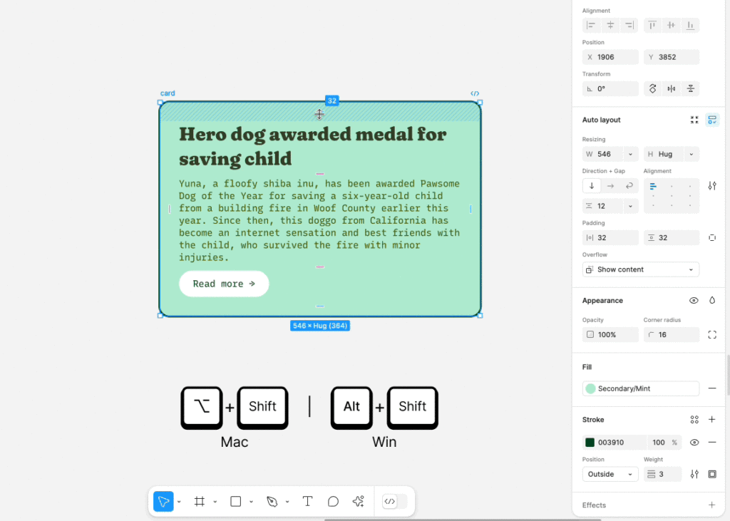 O Auto layout oferece propriedades que otimizam a criação de componentes e interfaces. Para ativá-lo, selecionae o frame ou objeto e pressione Control + Shift + A (Windows) ou Control + Shift + A (Mac).
