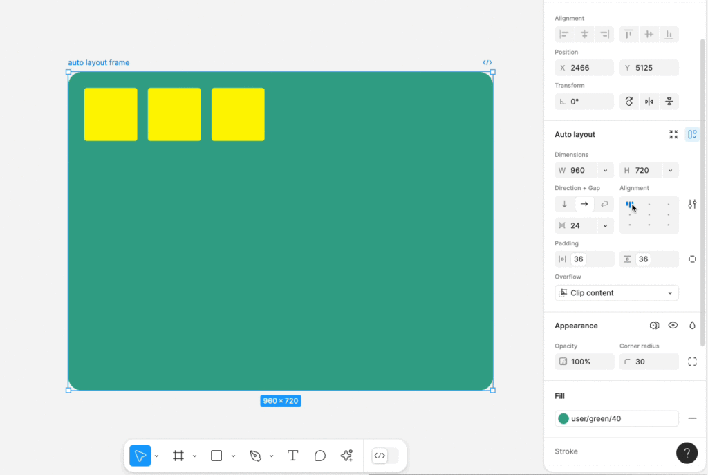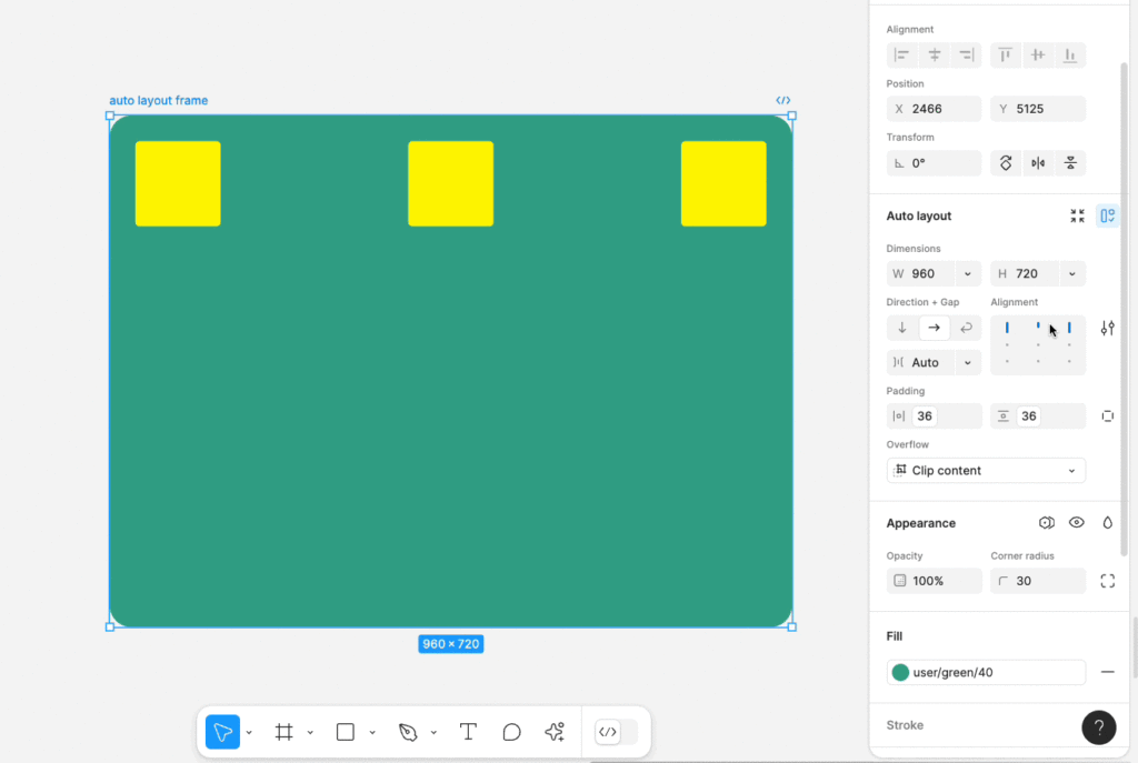 O alinhamento desejado pode ser facilmente ajustado na barra lateral de propriedades do frame ou do objeto no Auto layout.
